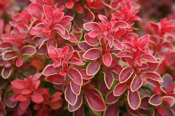 Description: A new introduction with lovely vibrant purple red leaves contrasting well with the yellow edge. Pale pink flowers are borne in the summer and followed by bright crimson berries in the autumn. The coloured foliage turns stunning bright crimson in the autumn. Forms a compact, rounded dome shaped shrub.