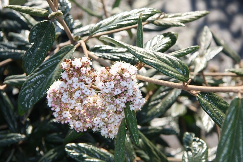 Description: Though similar to Viburnum rhytidophyllum (one of its parent) this Viburnum has smaller leaves and a more compact habit. The dark green evergreen leaves are deeply veined and wrinkled and form an excellent background to other plants. In spring large heads of cream flowers are seen.