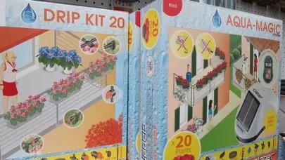 The Aqua Magic Solar Powered Drip Irrigation Kit contains all the components needed for up to 20 pots and is also powered by energy from the sun. The solar powered timer contains a small electric pump that draws the water and distributes water evenly to the pots.