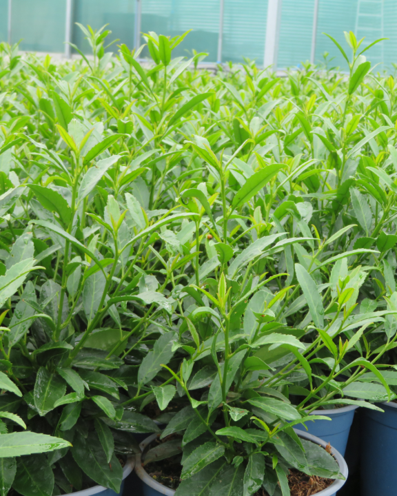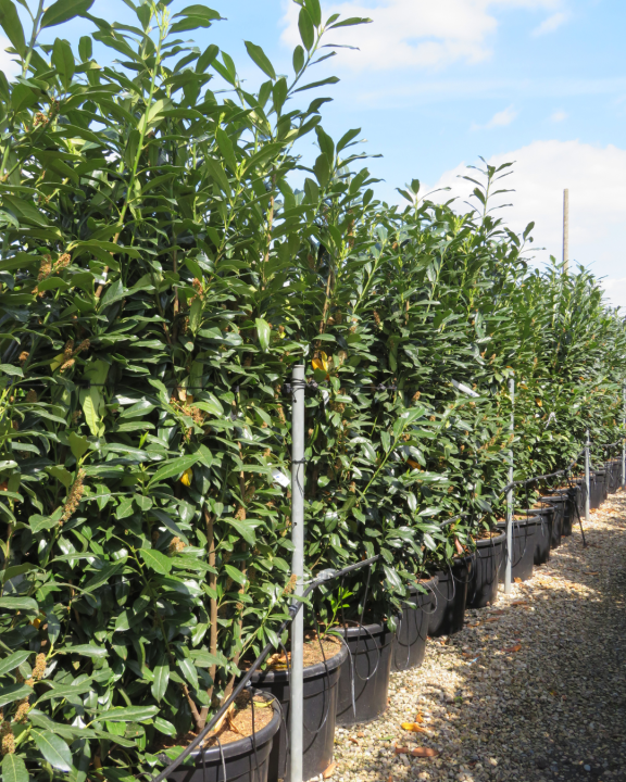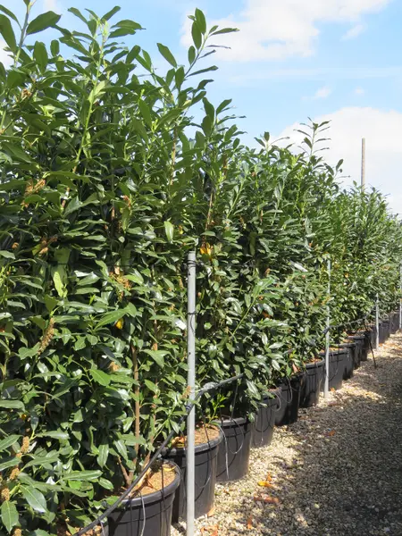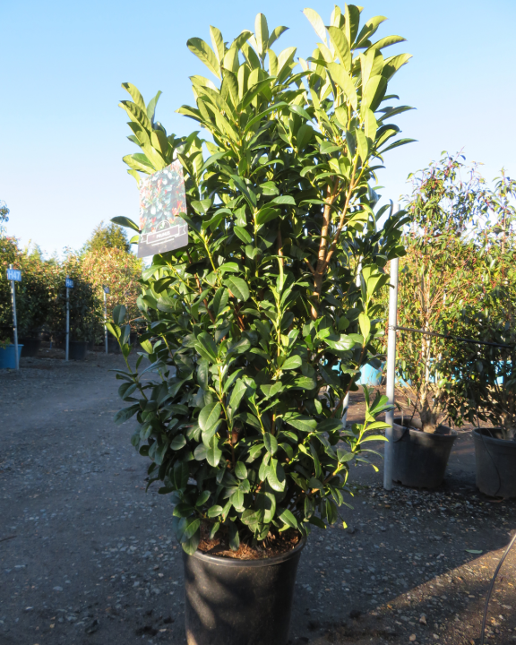 Prunus lau. 'Sofia'. An excellent choice for either hedging or topiary balls. Very compact growth habit with serrated leaves and easily pruned to shape. Excellent resistance to both heat and cold extremes. Slow growing.