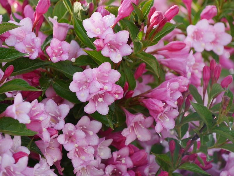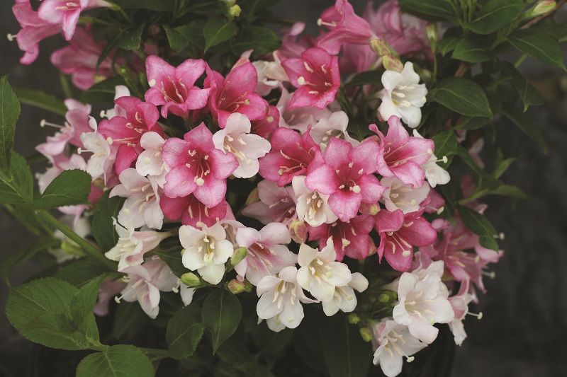 - Weigela ‘Colourtwist Twopink’. Flowers abundantly in spring with large flowers in two different shades of pink: rich and soft pink. Glossy green foliage makes this plant look handsome all season. Height 175cm