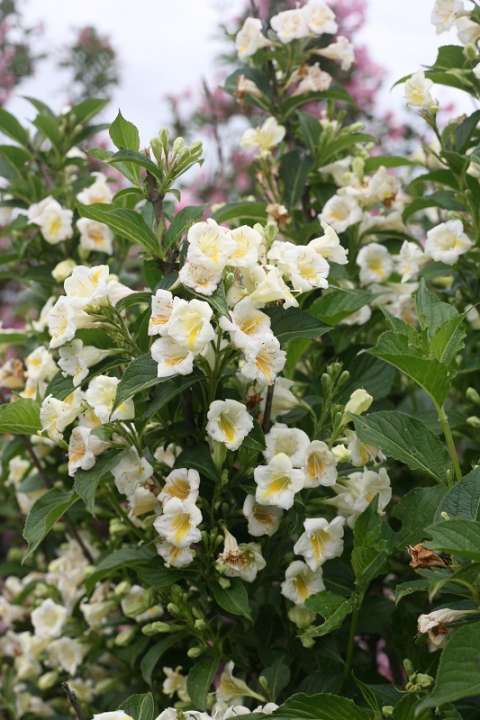- Weigela ‘Colourtwist ‘Sunny Side Up’. Flowers abundantly in spring with large unique white flowers with a sunny yellow spot in the centre contrasting wonderfully with the dark green foliage. Compact growth. Height 100cm