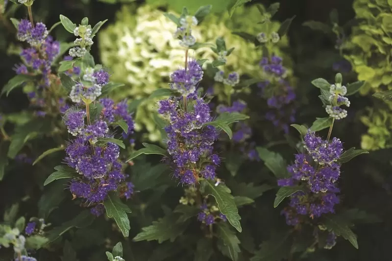 - Caryopteris ‘Beyond Midnight’. This plant adds colour to your garden late in the summer combing dark green glossy foliage, a compact habit with wonderful midnight blue flowers. Attracts pollinators. Height 80cm