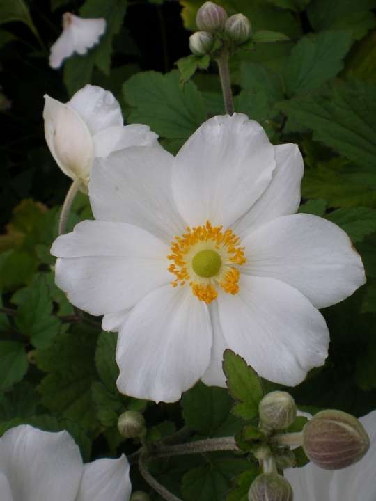 - Anemone x hybrida Honorine Jobert. Pure single white flowers September to November. 120cm height