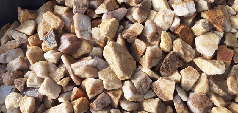 Hard wearing quartz angular chips in a mix of golden yellow, plum and purple stone. Perfect for use on a driveway or path. Available in bulk bags.