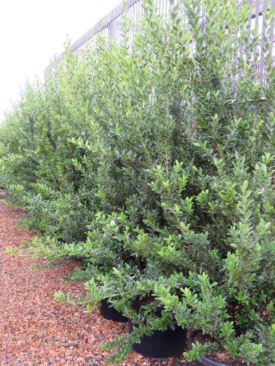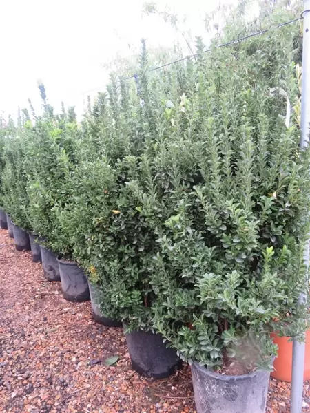 Ilex maximowicziana Kanehirae. This is an excellent alternative to Buxus hedging where height is needed. Faster growing than the more commonly known Ilex crenata this Ilex will reach 2m in height with pruning to keep in shape only required once a year. You can prune more often to give a more compact finish if required. The small, glossy, evergreen foliage forms a dense background for planting in front. Plant in slightly acidic soil.