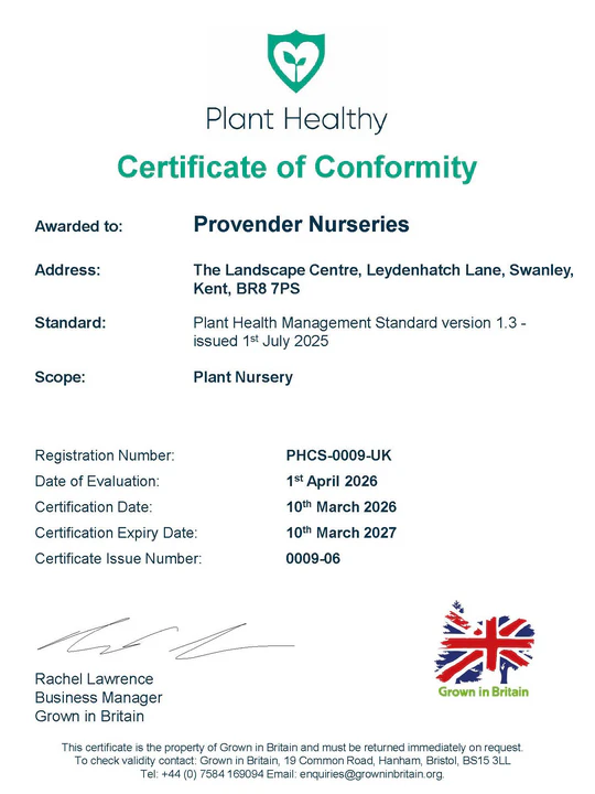 Provender Nurseries are certified Plant Healthy ensuring that the highest standards are met and upheld in the day to day purchasing, maintenance and supply of healthy plants to our customers.