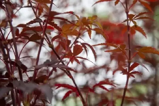 Japanese maple 'Skeeter's Broom' A red leaved Japanese maple with a neat deeply divided, palmate lobed foliage which is maroon red through spring and summer turning bright red in autumn. Multi-stemmed with compact and upright habit. Suited as with most Japanese Acers for specimen use, small gardens, mixed borders or container growing. For best colour and to avoid leaf scorch, Japanese Acers prefer dappled shade in a sheltered spot protected from full sun, frost and cold winds. Better on acid / neutral soils for best leaf colours. Must be well drained as dislikes winter wet - loamy sand would be ideal.