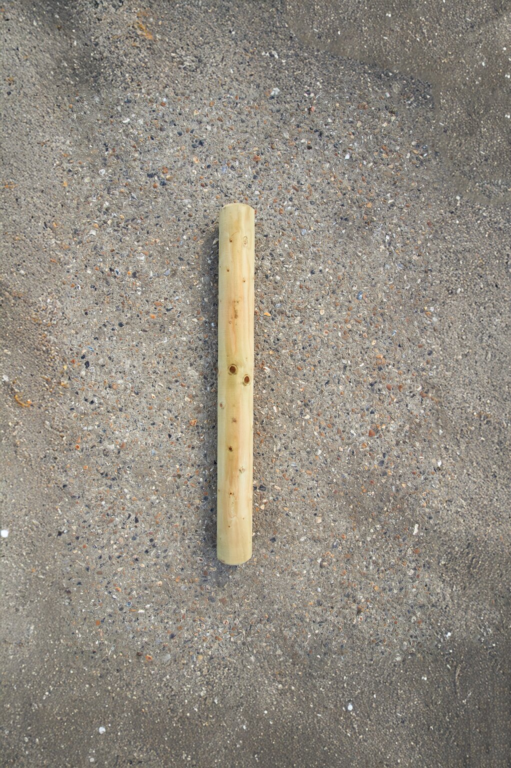 Plain machine rounded timber bollard. 120cm high, 150mm diameter, sawn flat, not pointed.