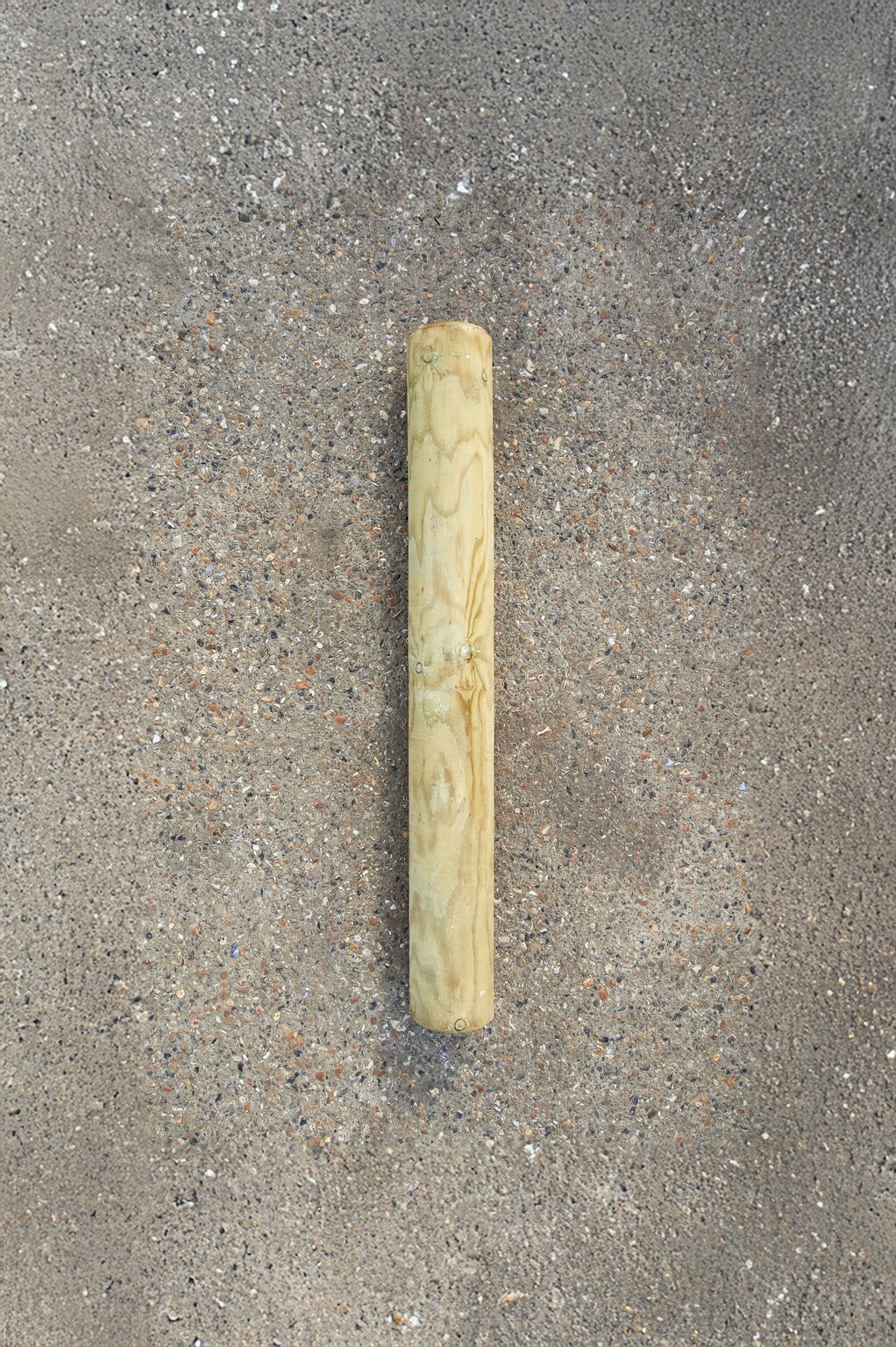 Plain machine rounded timber bollard. 100cm high, 100mm diameter, sawn flat, not pointed.