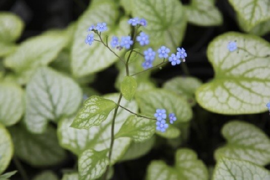 Heart-shaped, golden leaves fading to silver. Small blue flowers in spring. Best in part shade, so excellent for underplanting trees / shrubs. Moist soil. Height 30-60cm