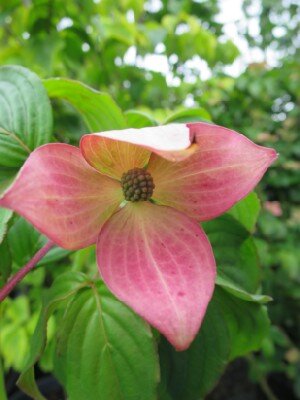 Deep pink bracts in June followed by strawberry-like fruits. Foliage rich reddish purple in autumn. An elegant shrub for any reasonable soil, but not for shallow chalk. Height 4 metres.