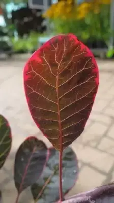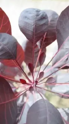 A superb, new dwarf shrub of the similar and very popular Cotinus coggygria 'Royal Purple'. Compact, slow growing, small bushy shrub with oval, deep purple leaves, turning gorgeous shades of red, orange and yellow in the autumn. Masses of pale pink, plume-like flowers from July to August that give a smoke like effect. Height and spread 1.2m