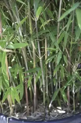 Clump forming Bamboo. Looks good in winter, holds most of its leaves giving dense foliage all year. Blue-green culms growing into a fountain shape. Plant in a sheltered spot away from cold winds. Height 3 metres, spread 1.5 metres.Only 2 left