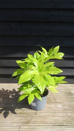 Japanese aralia, Castor oil plant. An excellent evergreen foliage plant with bold rich green leaves which are palmate in shape. This architectural plant is very effective in a garden design as a backdrop for other plants. It is often used in tropical gardens and requires a sheltered and protected site to avoid winter damage. mature plants will produce interesting globular green white flower heads followed by black fruits which remain throughout winter. This plant is tolerant of air pollution and salt spray. Often used in sheltered courtyards to create a dramatic focal point. Can tolerate some sun but does best in dappled to deep shade. Height up to 2.5m. Spread up to 2m. Prefers a moist, well-drained soil.