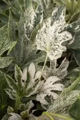 Spider's Web Japanese Aralia Fatsia are evergreen plants with large, leathery, deeply lobed leaves. The new cultivar 'Spiders Web' has green leaves with white variegation which can be speckled or with blotches which are dotted around the leaf margins or through to the centre of the leaf. Clusters of white flowers in late autumn/winter, followed by black berries. Good as an accent plant in shrub borders or architectural settings such as courtyards. Prefers shade. Will also tolerate dry shade once established, and so is a good choice for this type of problem area. In sun then smaller paler leaves are produced. Height/Spread: 2.5 x 2.5metres, Prefers a fertile soil.Only 1 left
