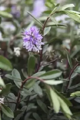 HEBE 'Marjorie'. A compact rounded evergreen shrub with glossy green leaves. Blue-mauve flower spikes fading to white in midsummer to early autumn. Frost hardy. Shelter from cold drying winds. Height to 1.2m, spread to 1.5m.VERONICA 'Marjorie'