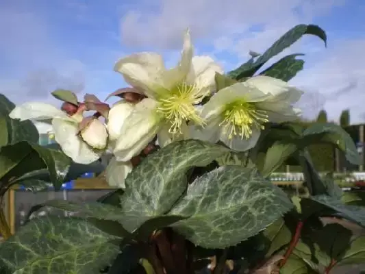 A clump forming, evergreen to semi-evergreen perennial. Dark green leathery leaves with silver-grey veins and white flowers turning pink then red with age. Height 35cm. Harmful if eaten / skin irritant.HELLEBORUS x ericsmithii 'Winter Moonbeam'