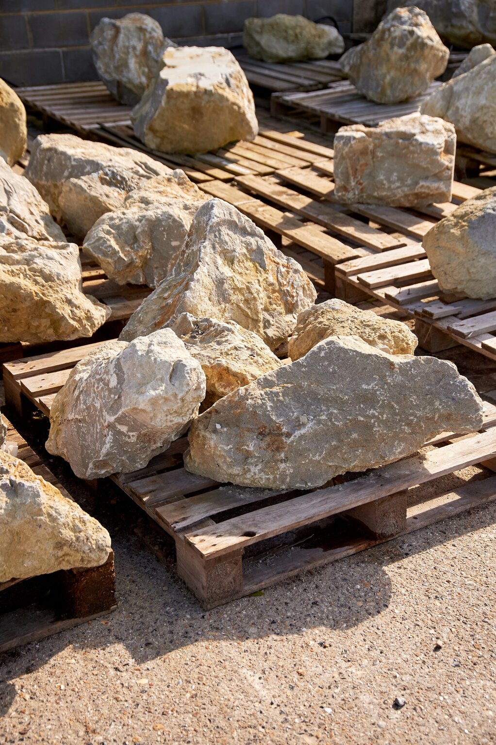 Sourced from a local quarry in Maidstone, hewn rock, not shaped, in the range of 300 to 399kg. Can be used to make rock features, deny access, as a protection for shorelines, or along rivers to dissipate waves, and scouring by rivers.