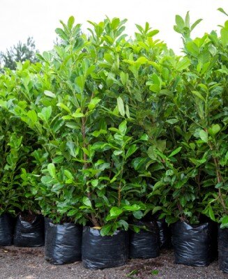 Cherry Laurel Evergreen vigorous shrub with large glossy green leaves.Spikes white flowers in April, followed by black fruits.Suits most soils, shade tolerant. Height 3 metres.Seed kernels harmful if eaten.Only 2 left