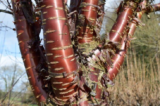 Paperbark or Tibetan Cherry Grown for its polished red-brown mahogany-like bark. Grow in a spot where it will catch the winter sunshine. Small white flowers in spring and great autumn foliage colour. Height 12m
