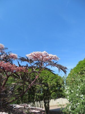 Sambucus nigra 'Eva' Dark purple, nearly black, cut-leaved foliage. Clusters of creamy-pink buds in May and June which open into 15cm inflorescences of tiny pink, fragrant flowers, followed in autumn by red-black berries which remain until October.Only 1 left