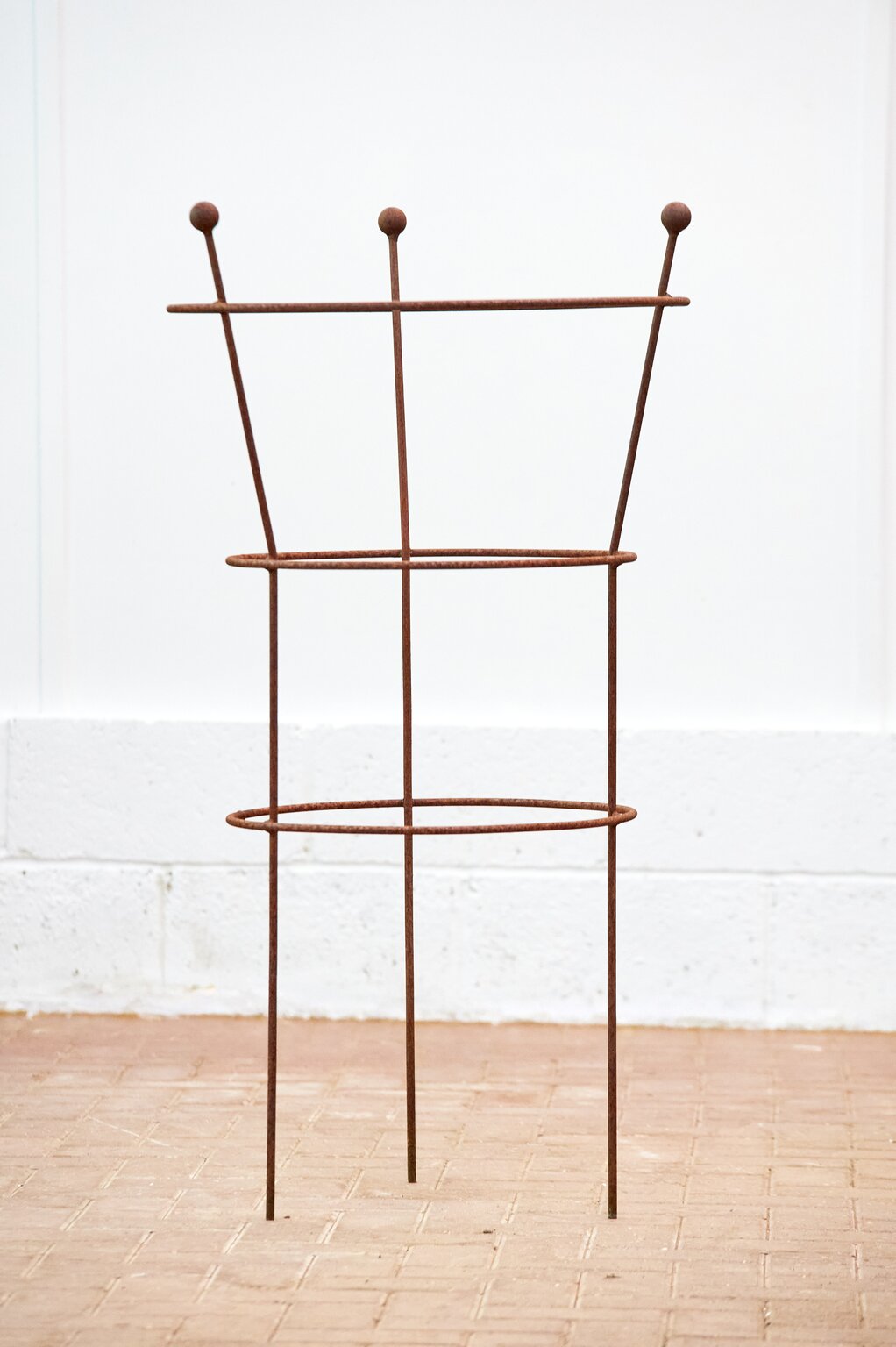 Made from 10mm round steel bar, welded, and topped with attractive ball finials. Natural rust finish. Use in the garden on herbaceous plants allowing them to grow up and spill over the support.Only 3 left